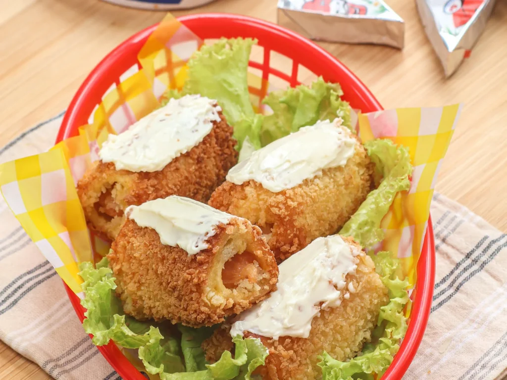 Make a special snack with this cheese-topped sausage roll bread recipe! Sausages wrapped in white bread coated with egg and breadcrumbs, topped with creamy The Laughing Cow Creamy Cheese. Just 15 minutes to create the perfect crispy snack for your family.